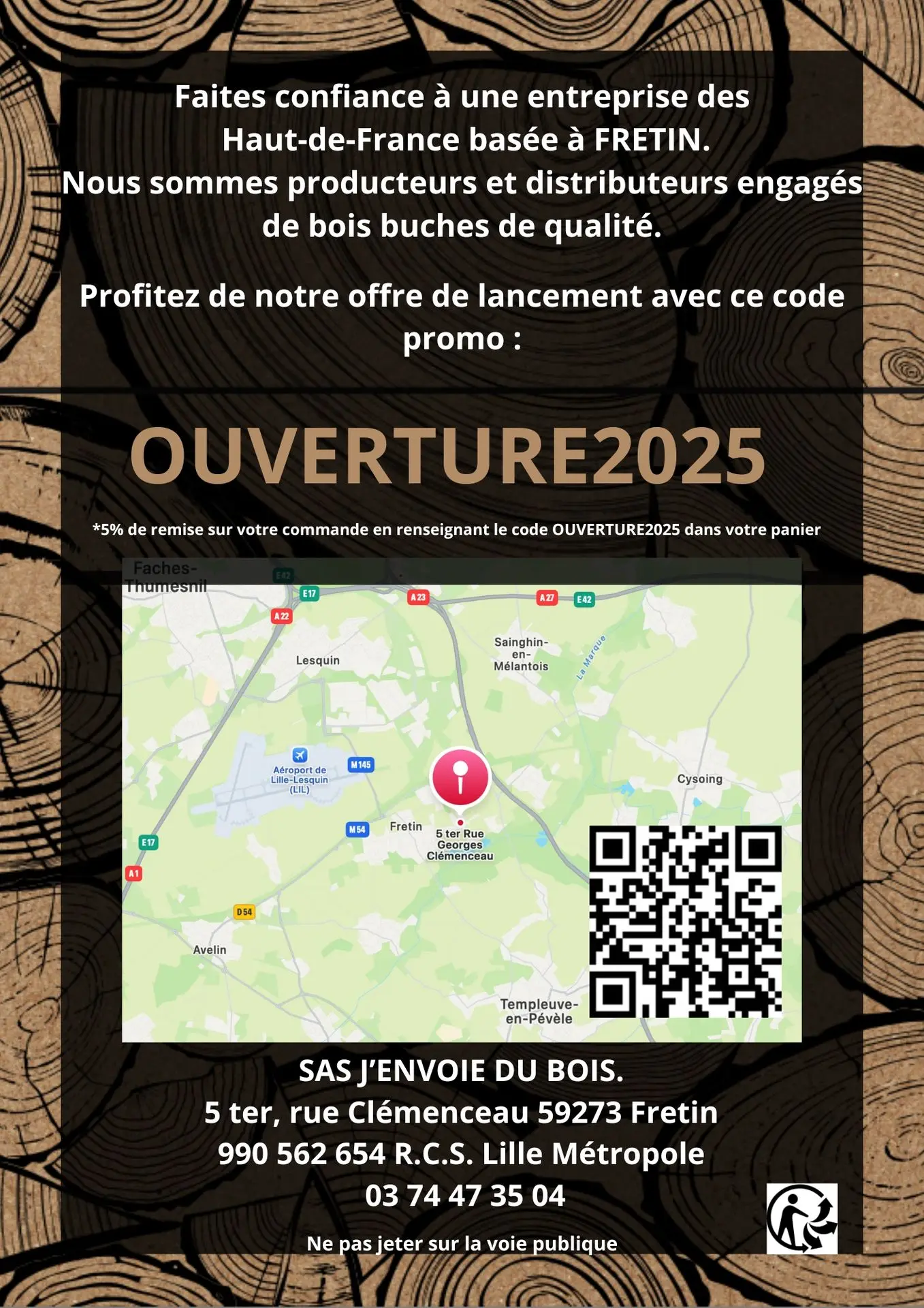 En plus de cela, ce flyer vous fait profiter de notre code promo de lancement avec une remise de 5% sur vos commandes de bois de chauffage. Pour cela, saisissez le code promo "OUVERTURE2025" directement dans votre panier.